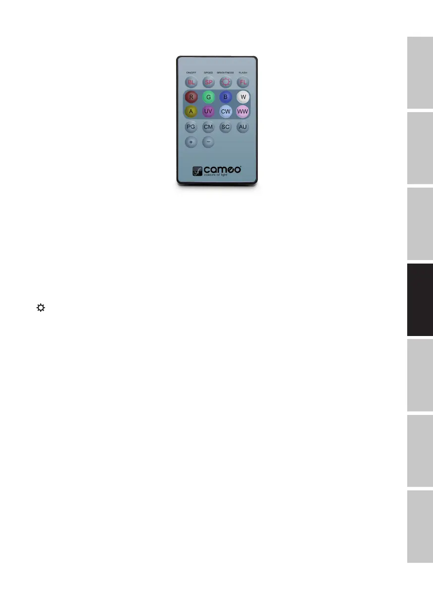 Con los 6 botones R, G, B, W, A y UV se pueden crear mezclas de colores individuales (modo estático: Static). Pulse el botón que corresponda