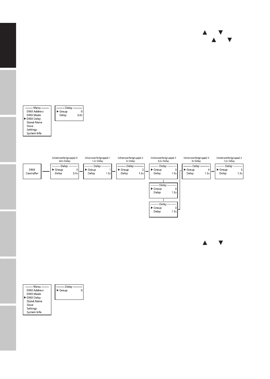 The delay time (delay time of the DMX signal) is set using a DMX controller in the separate DMX