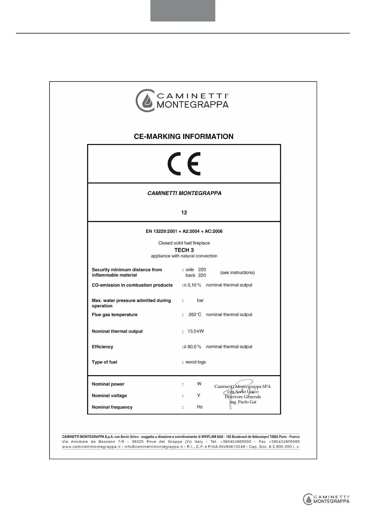 Caminetti Montegrappa TECH 3 - Certifications and Patents; CE Marking Information