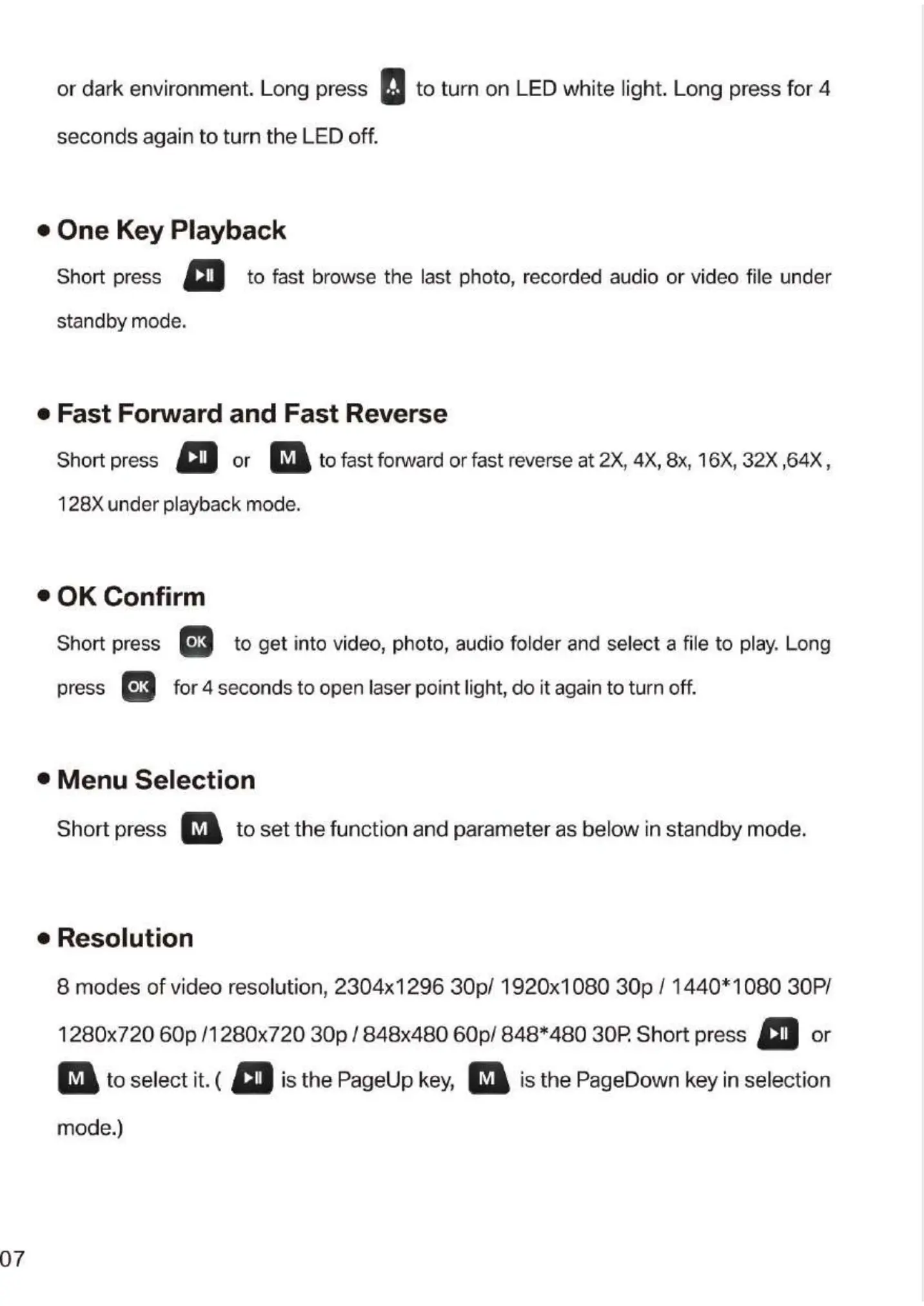 to turn on LED white light. Long press for 4