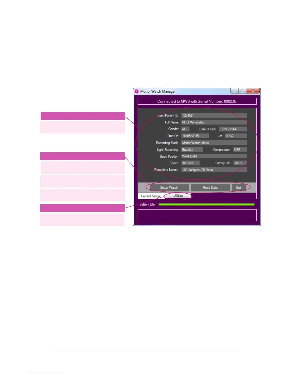 The MotionWatch setup options will be explained in detail