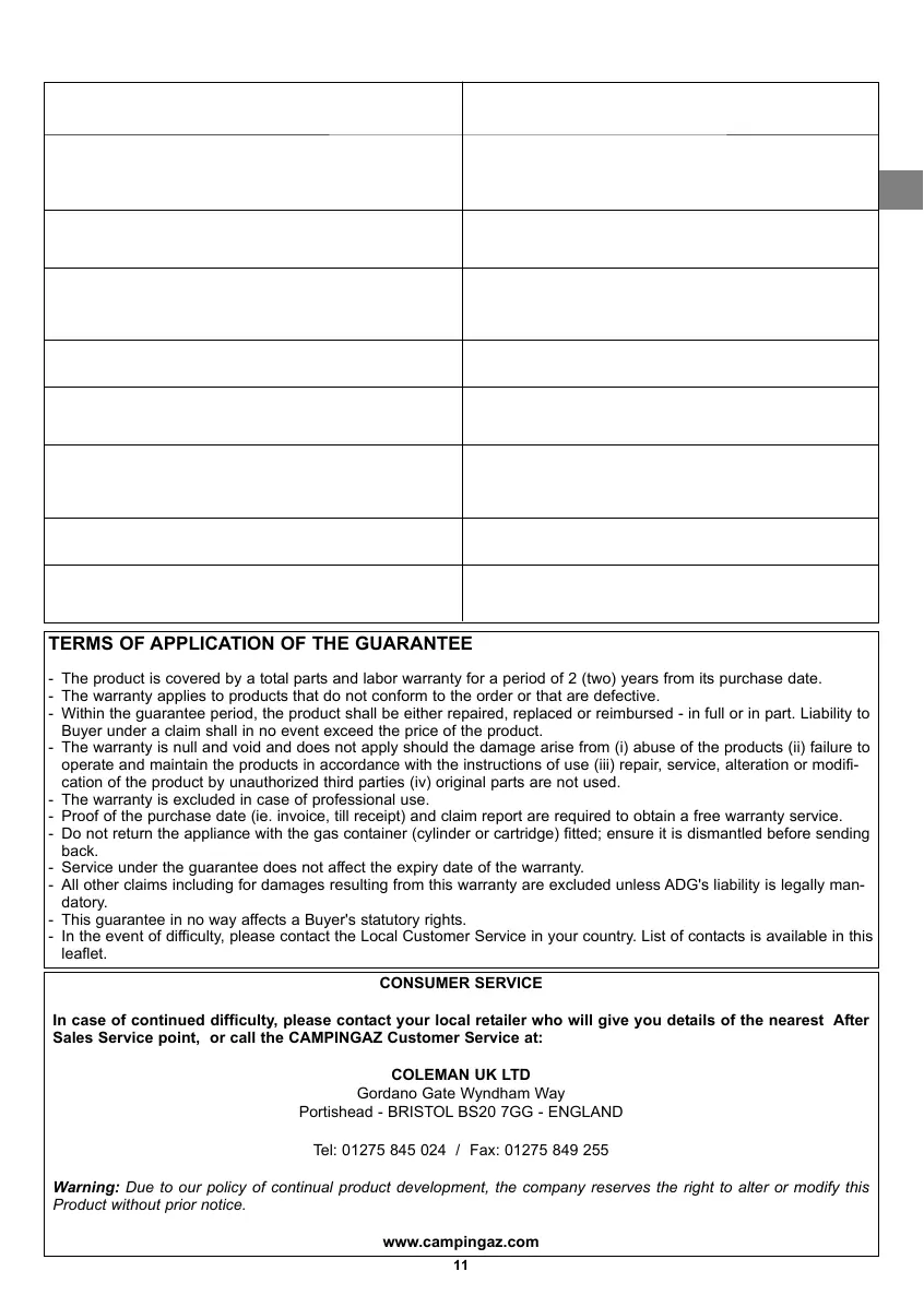 Sales Service point, or call the CAMPINGAZ Customer Service at: