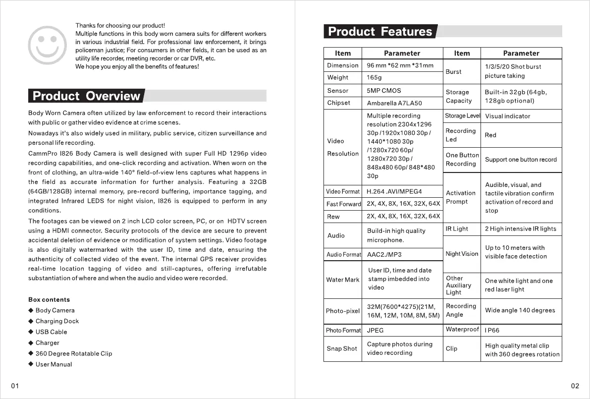 CamPro 1826 - Product Overview and Features; Box Contents; Product Specifications