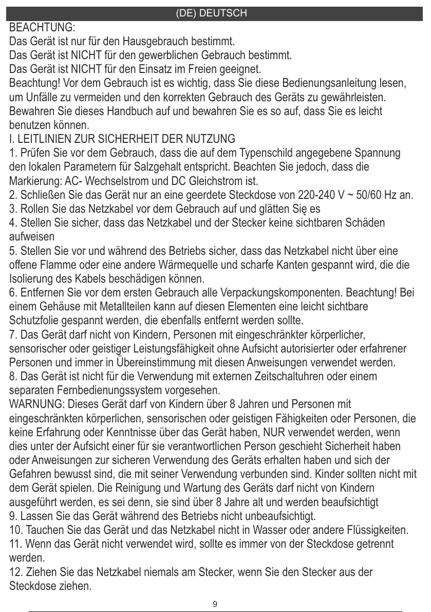 Das Gerät ist NICHT für den gewerblichen Gebrauch bestimmt.
