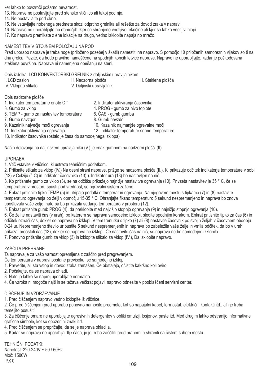 IV. Vklopno stikalo V. Daljinski upravljalnik