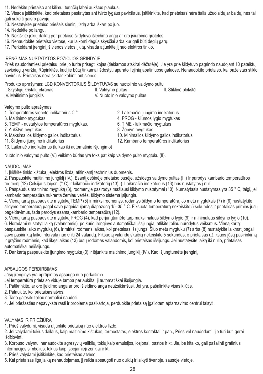 15. Nekiškite jokių daiktų per prietaiso šildytuvo išleidimo angą ar oro įsiurbimo groteles.