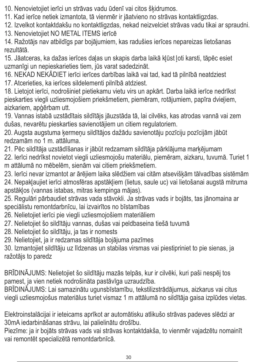 30. Izmantojiet sildītāju uz līdzenas un stabilas virsmas vai piestipriniet to pie sienas, ja