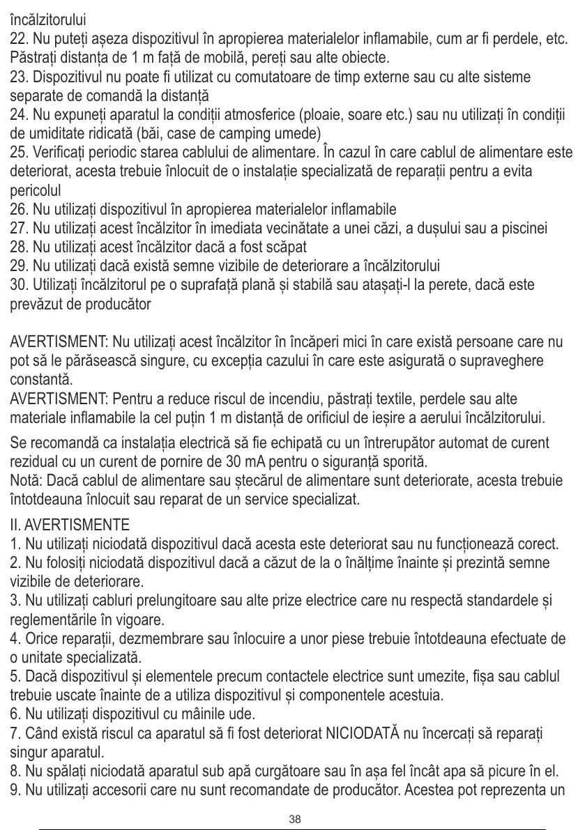 29. Nu utilizați dacă există semne vizibile de deteriorare a încălzitorului