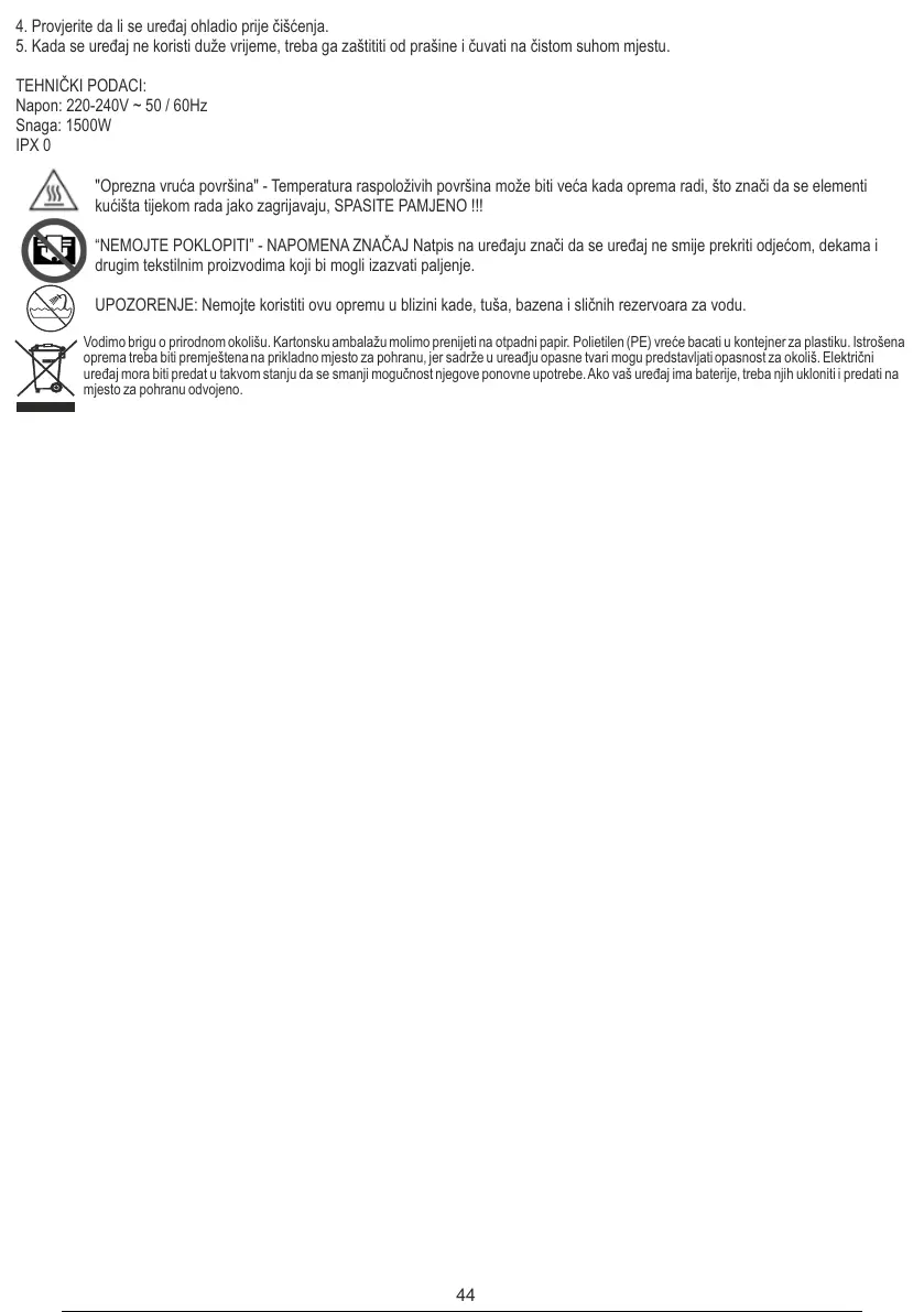 “NEMOJTE POKLOPITI” - NAPOMENA ZNAČAJ Natpis na uređaju znači da se uređaj ne smije prekriti odjećom, dekama i