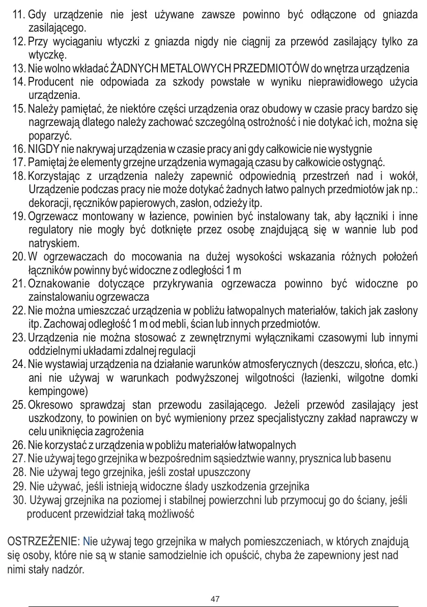 29. Nie używać, jeśli istnieją widoczne ślady uszkodzenia grzejnika