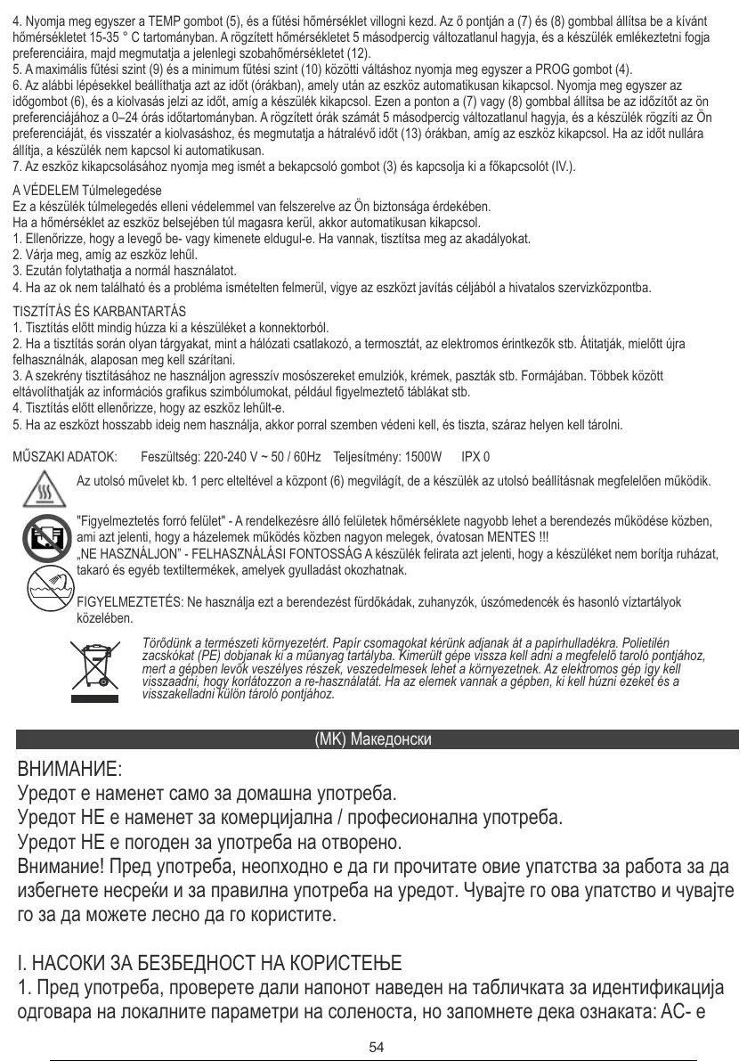 MŰSZAKI ADATOK: Feszültség: 220-240 V ~ 50 / 60Hz Teljesítmény: 1500W IPX 0