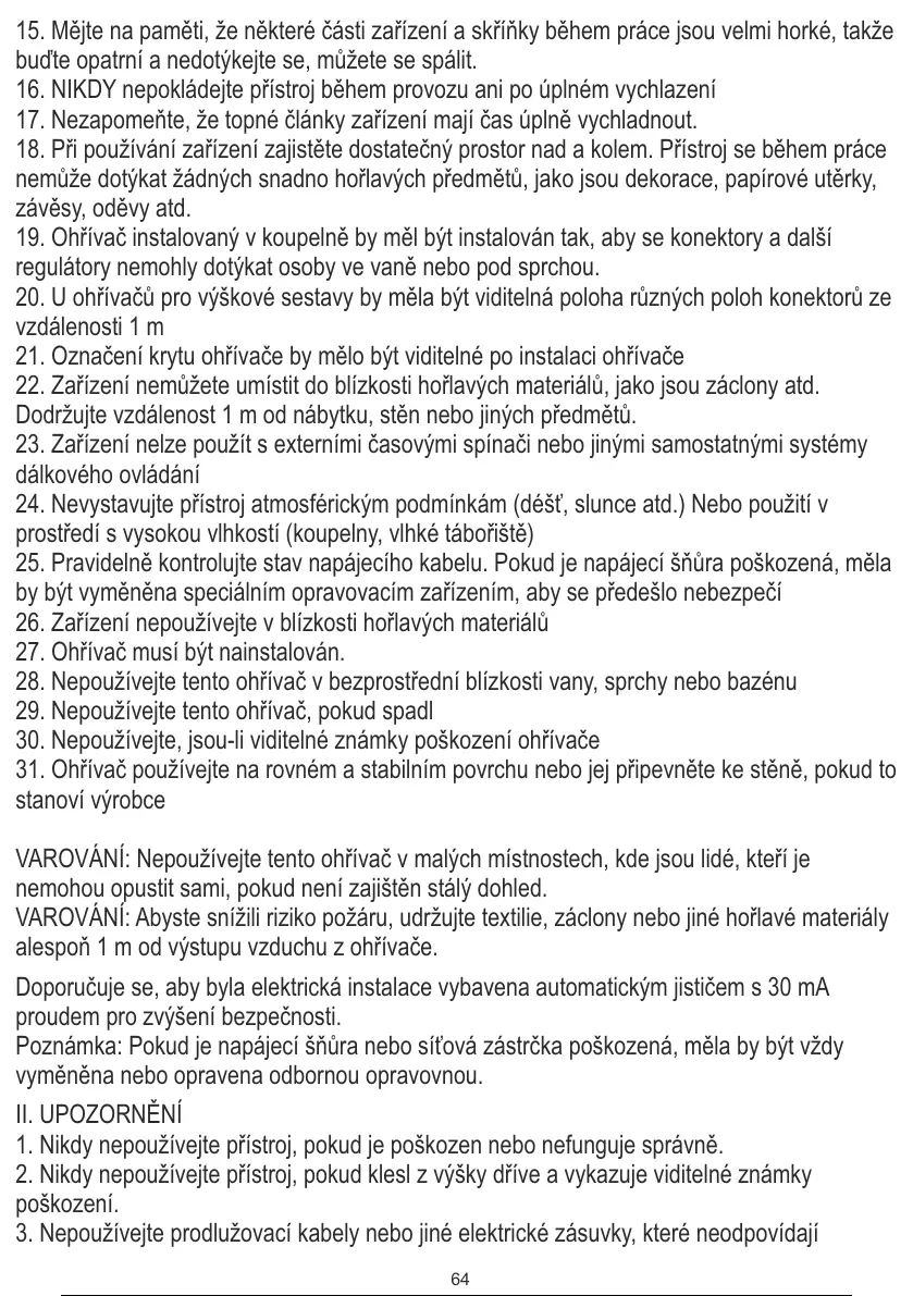 31. Ohřívač používejte na rovném a stabilním povrchu nebo jej připevněte ke stěně, pokud to