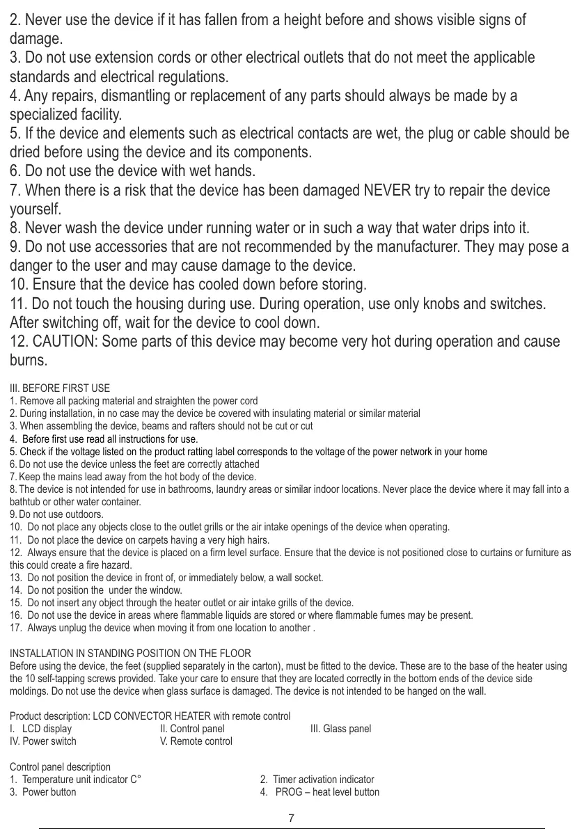 moldings. Do not use the device when glass surface is damaged. The device is not intended to be hanged on the wall.