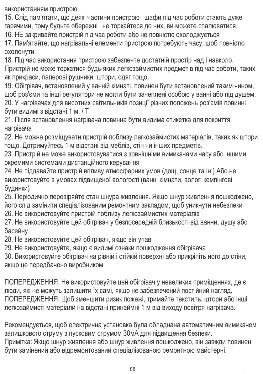 27. Не використовуйте цей обігрівач у безпосередній близькості від ванни, душу або