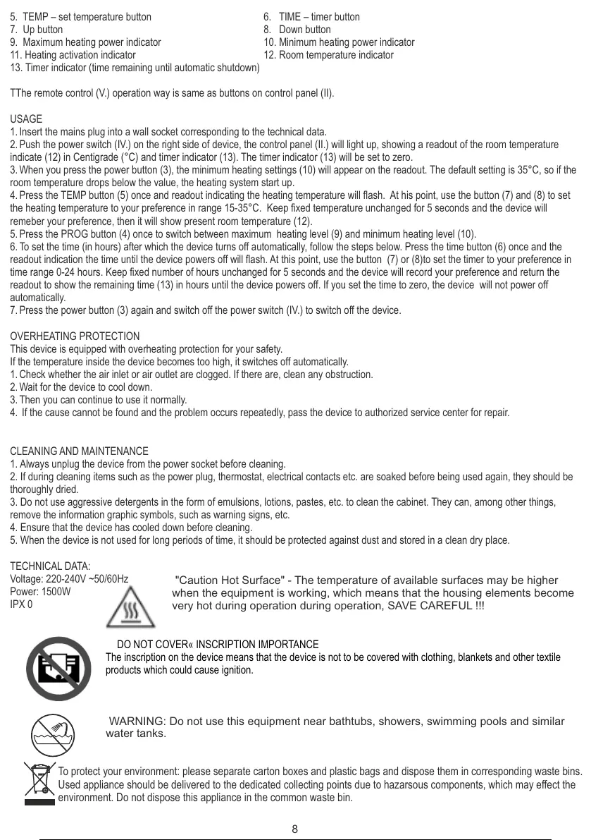 5. TEMP – set temperature button 6. TIME – timer button