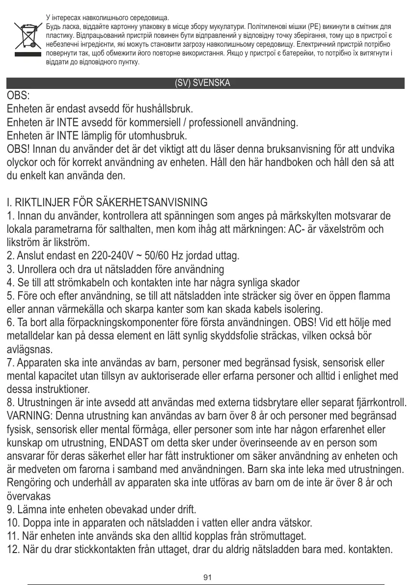 8. Utrustningen är inte avsedd att användas med externa tidsbrytare eller separat fjärrkontroll.