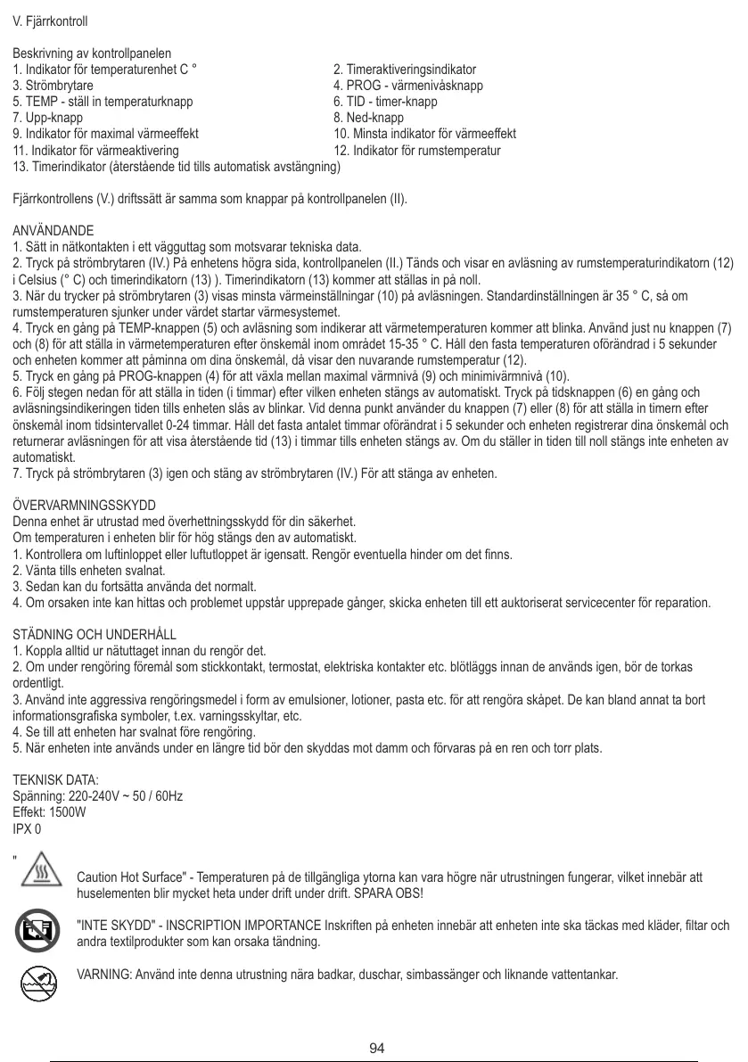 Fjärrkontrollens (V.) driftssätt är samma som knappar på kontrollpanelen (II).