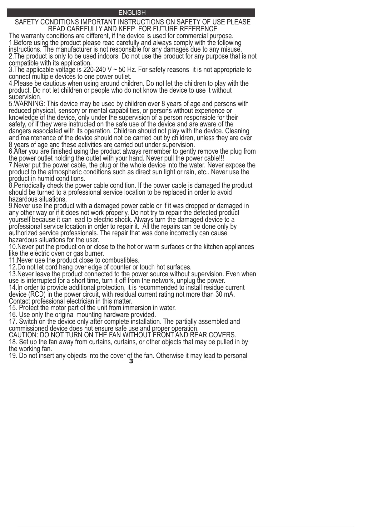 19. Do not insert any objects into the cover of the fan. Otherwise it may lead to personal