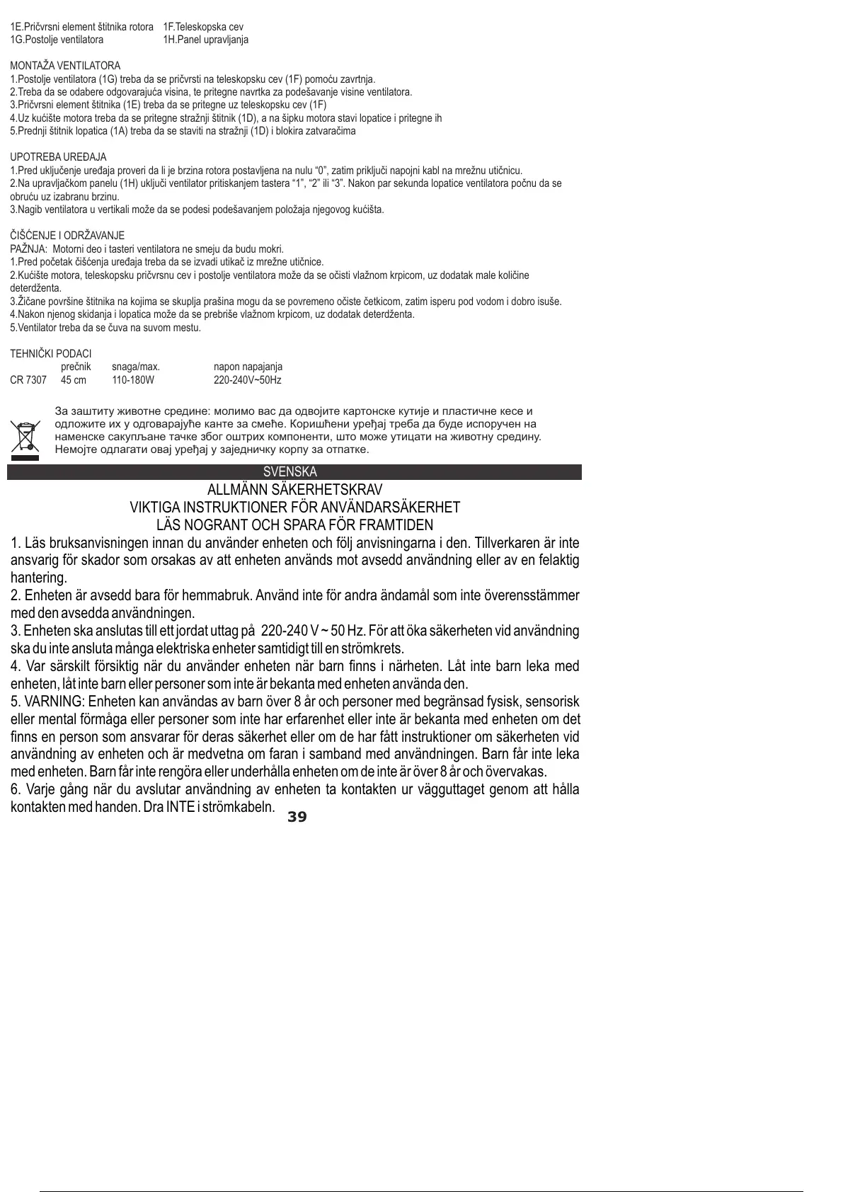 CR 7307 45 cm 110-180W 220-240V~50Hz