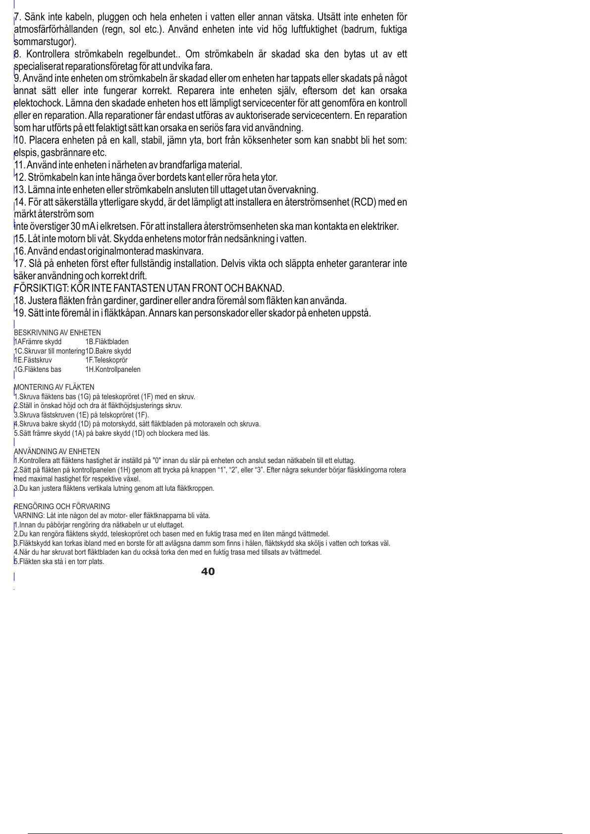 19. Sätt inte föremål in i fläktkåpan. Annars kan personskador eller skador på enheten uppstå.