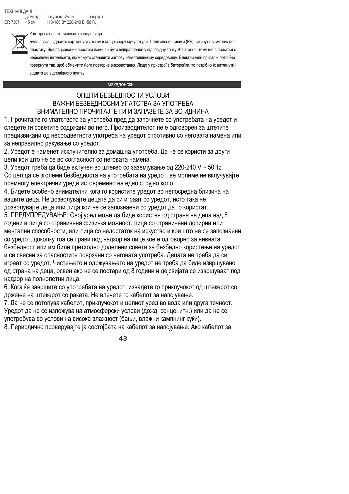 5. ПРЕДУПРЕДУВАЊЕ: Овој уред може да биде користен од страна на деца над 8