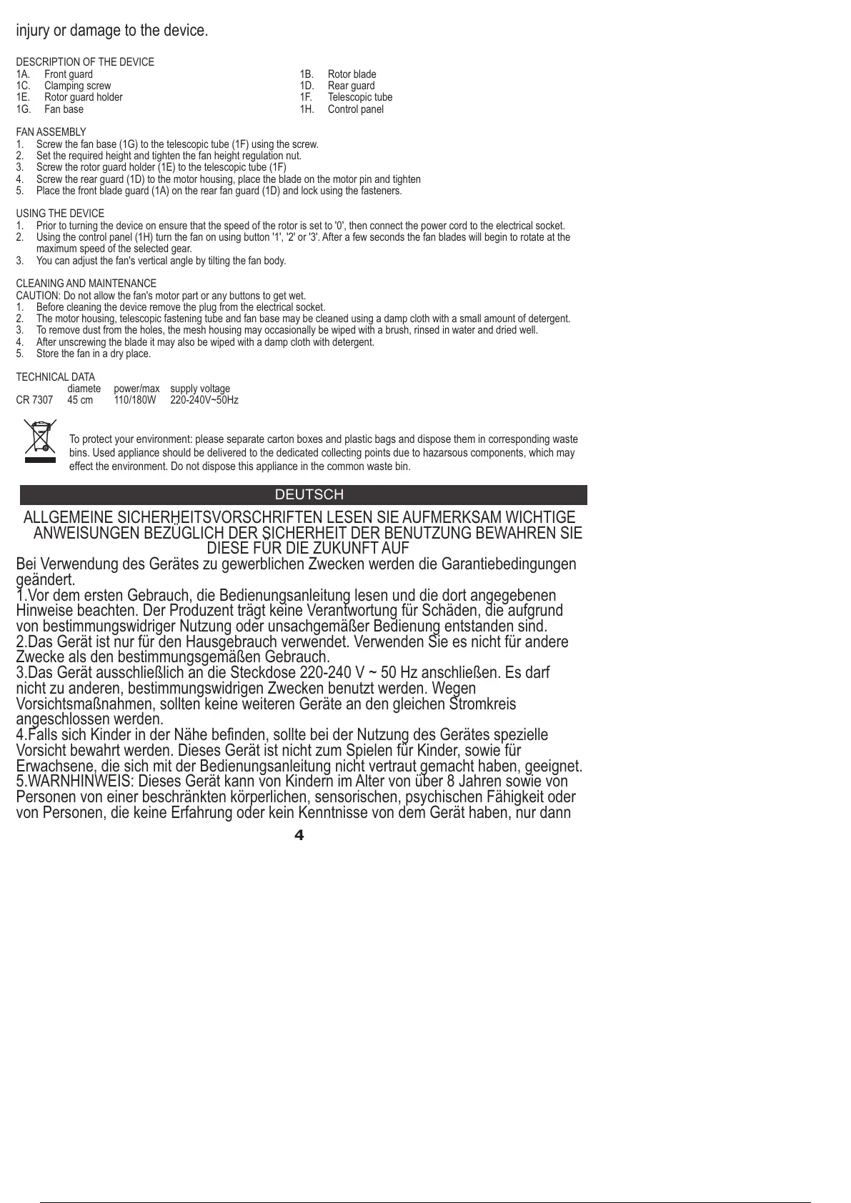 CR 7307 45 cm 110/180W 220-240V~50Hz