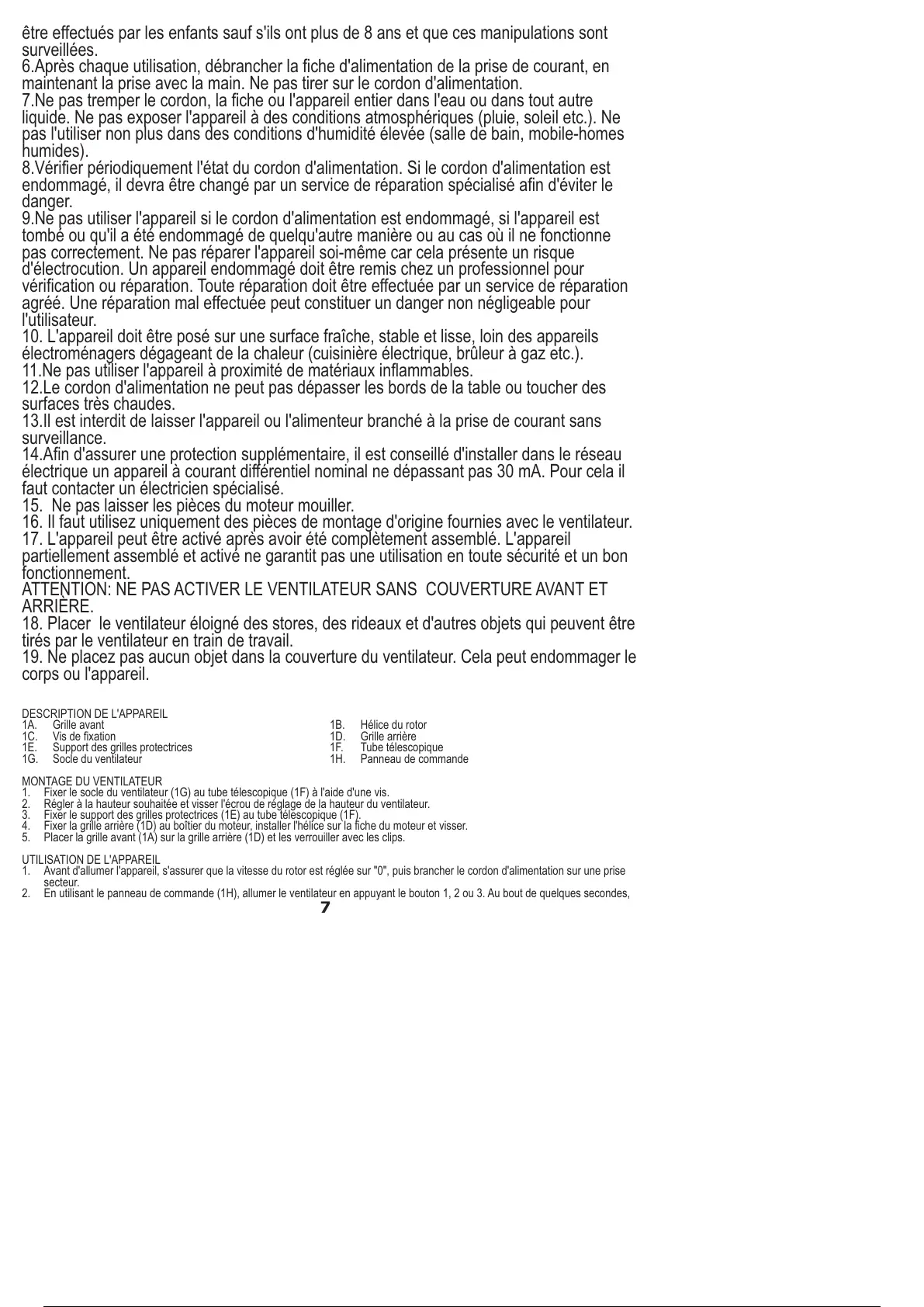 19. Ne placez pas aucun objet dans la couverture du ventilateur. Cela peut endommager le