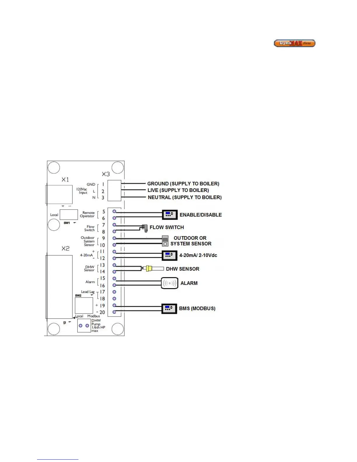 terminal board on boiler 2 (B-2). If the outdoor sensor is not connected to the Master boiler the DynaMax HS Controller will