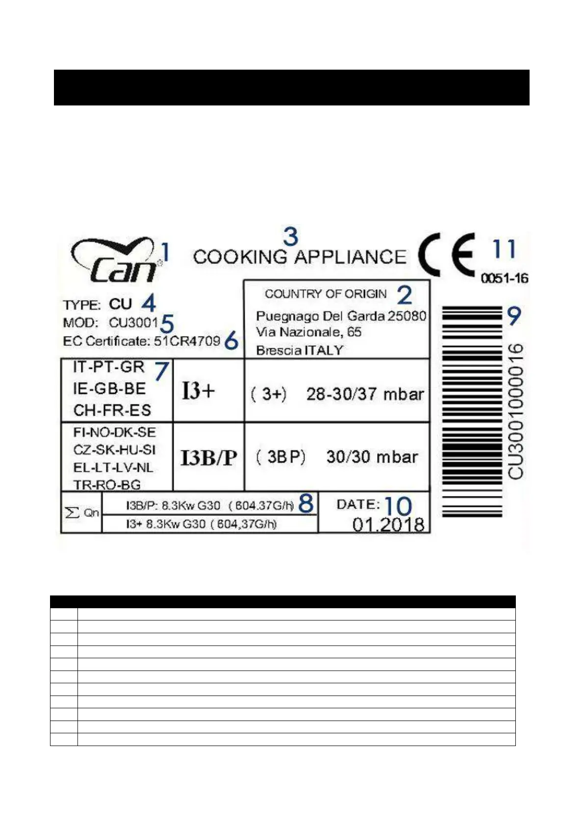 the product, reporting the details of the serial number, typology/functionality