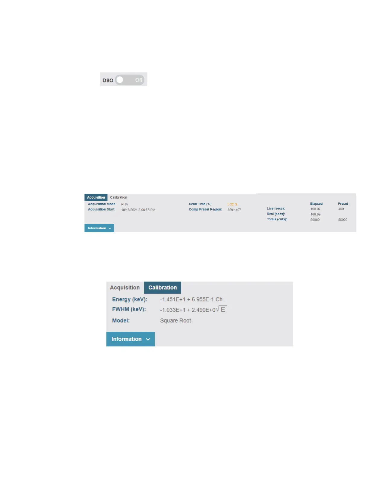 Displays Acquisition Mode, Acquisition Start time, Dead Time, Preset and