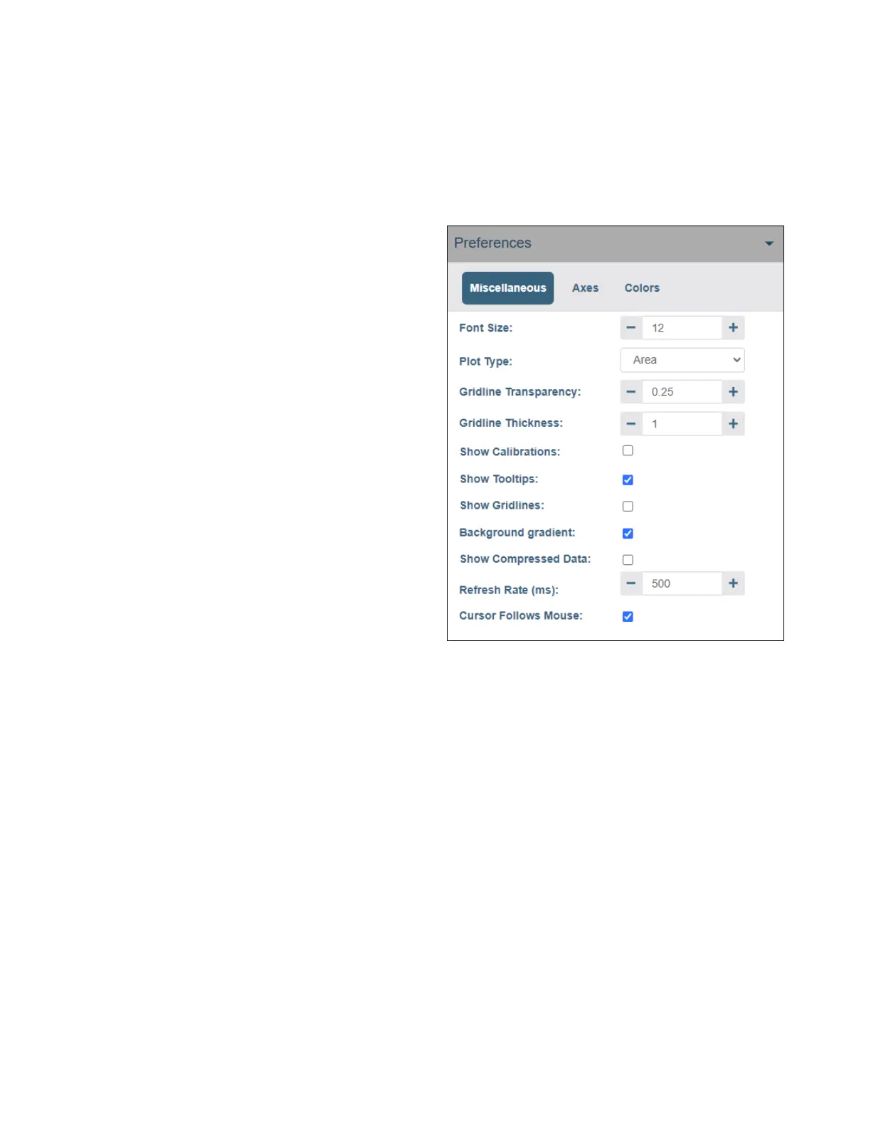 • Font Size adjusts the plot axis tick, label, and cursor tooltip font size from size 8 to