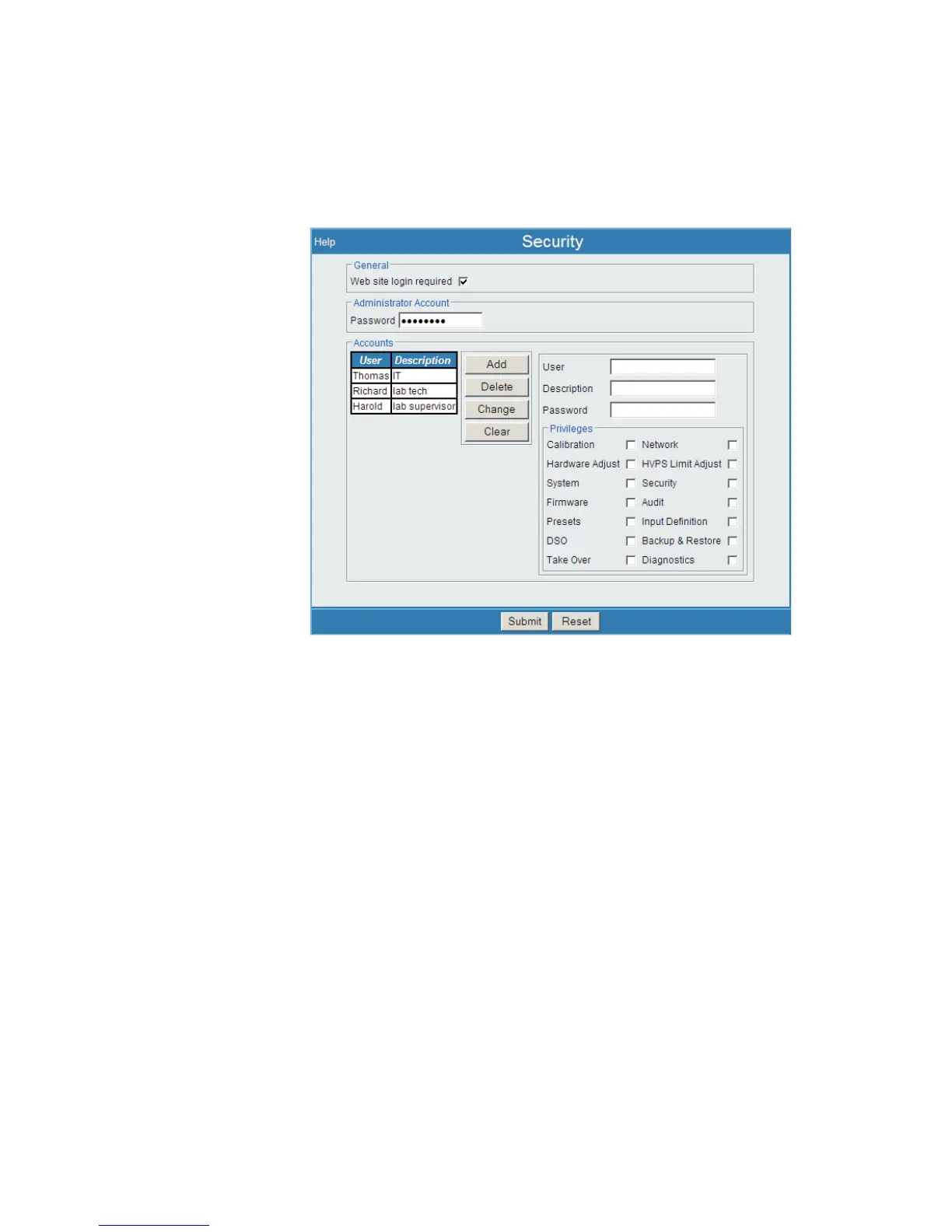 Each User account consists of the login Name, Password, and checkboxes for privi