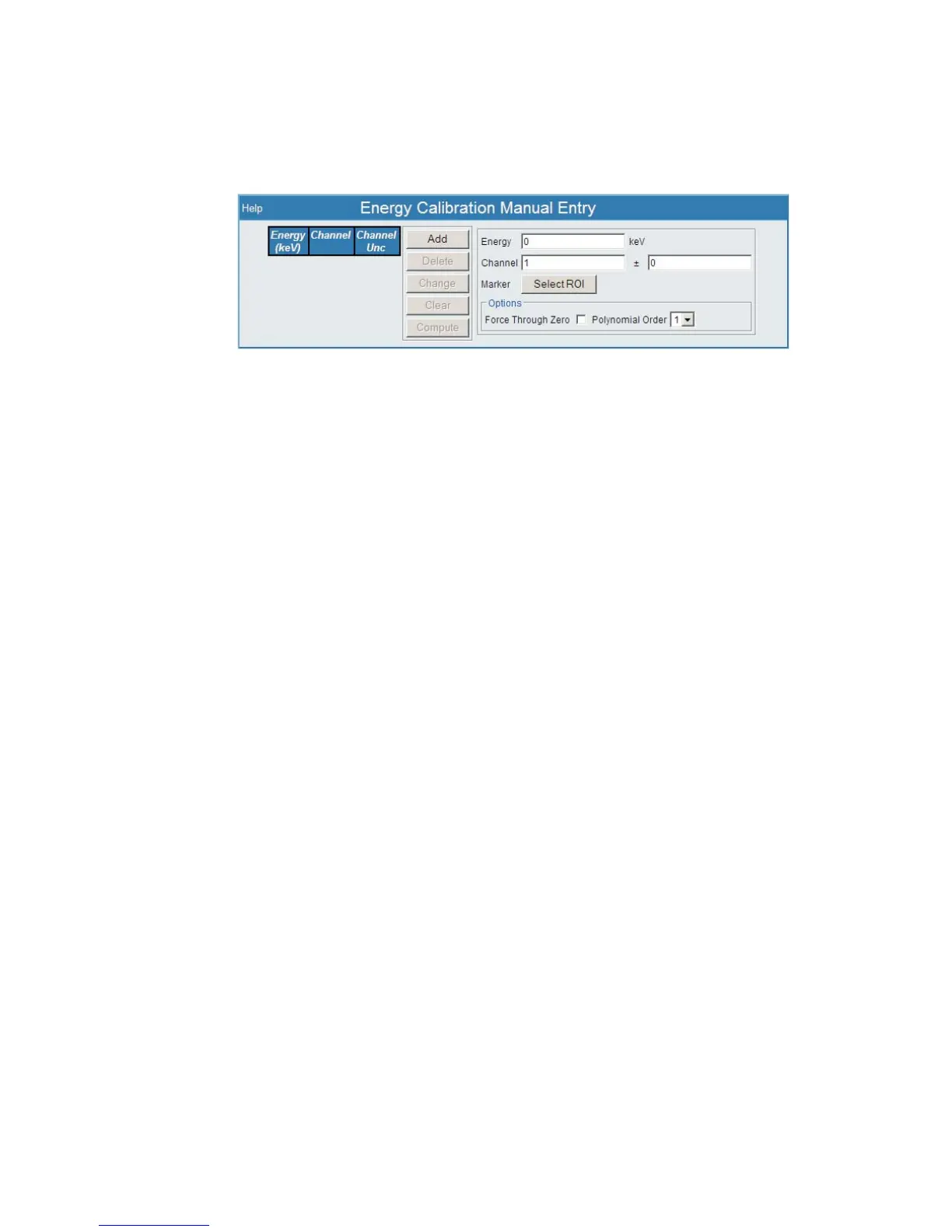The Manual Entry area allows you to enter data to compute an energy calibration.