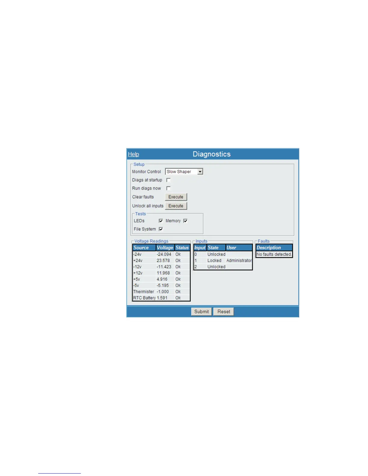 The Diagnostics page executes various diagnostic features on the Lynx system hard