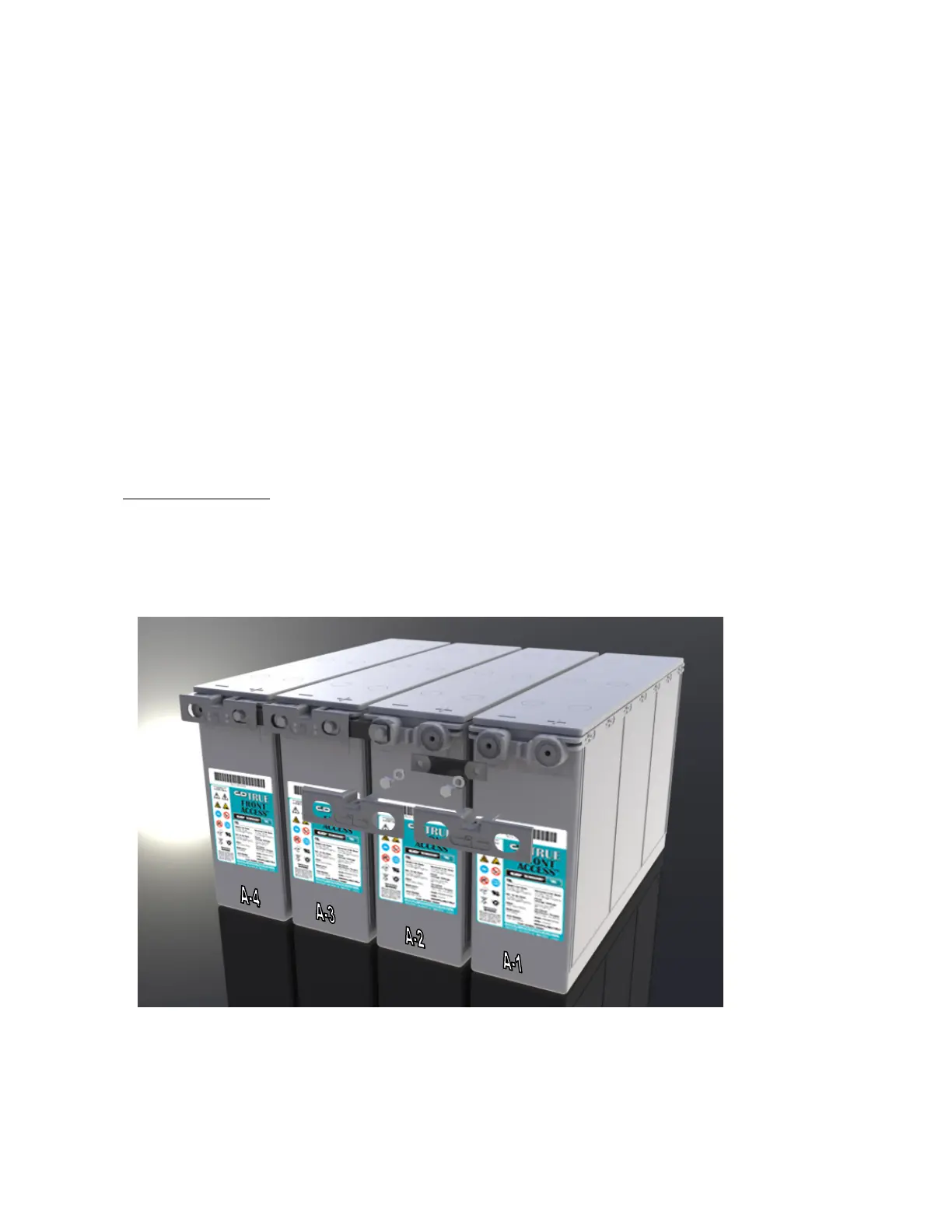 Front access batteries are heavy, typically over 100 pounds each. Make sure proper lifting and moving