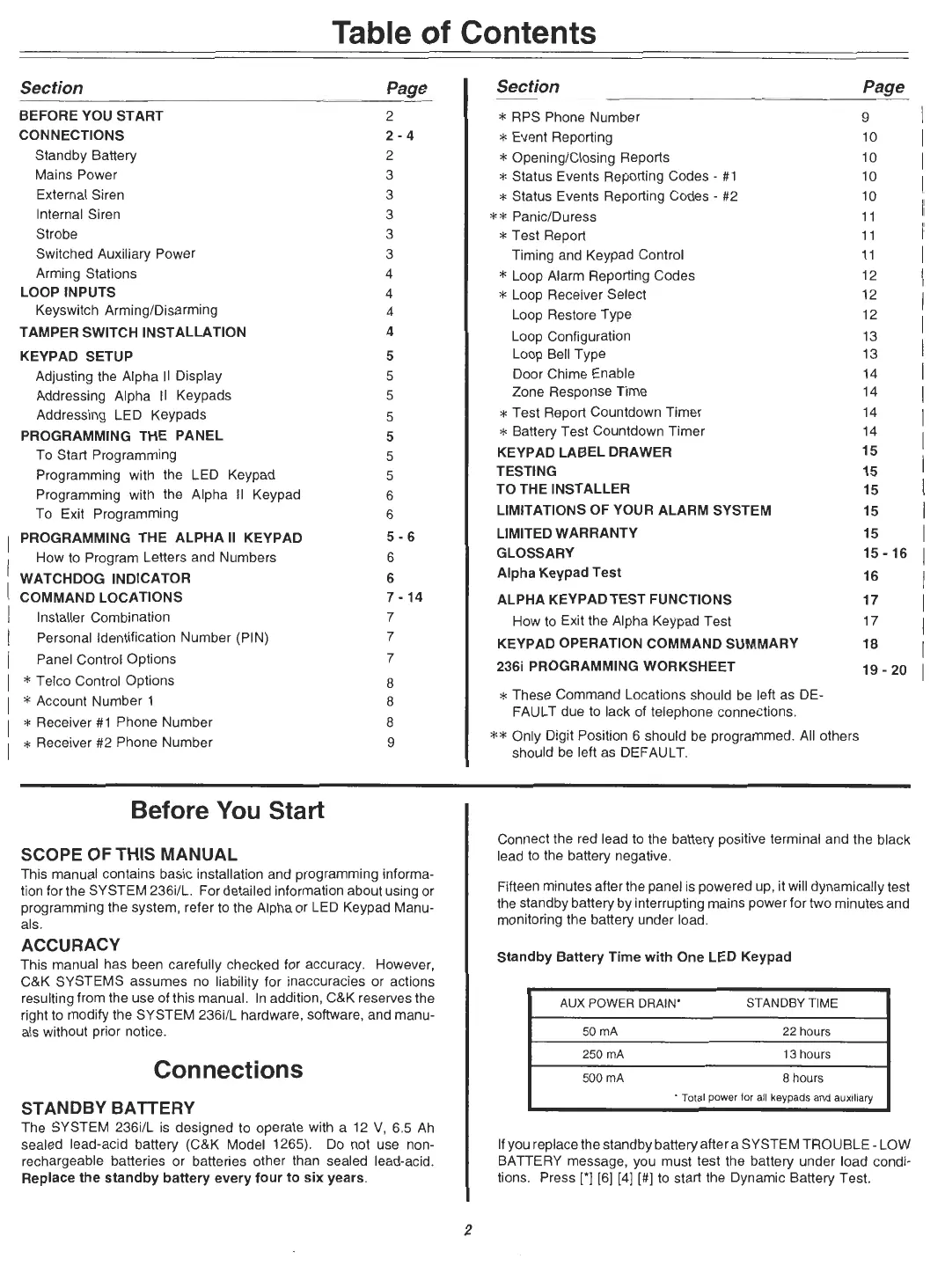 C&K systems 236i/L - System Wiring and Input Configuration; Power Supply and Device Connections; Loop Input and Tamper Switch Wiring; Keypad Setup and System Programming
