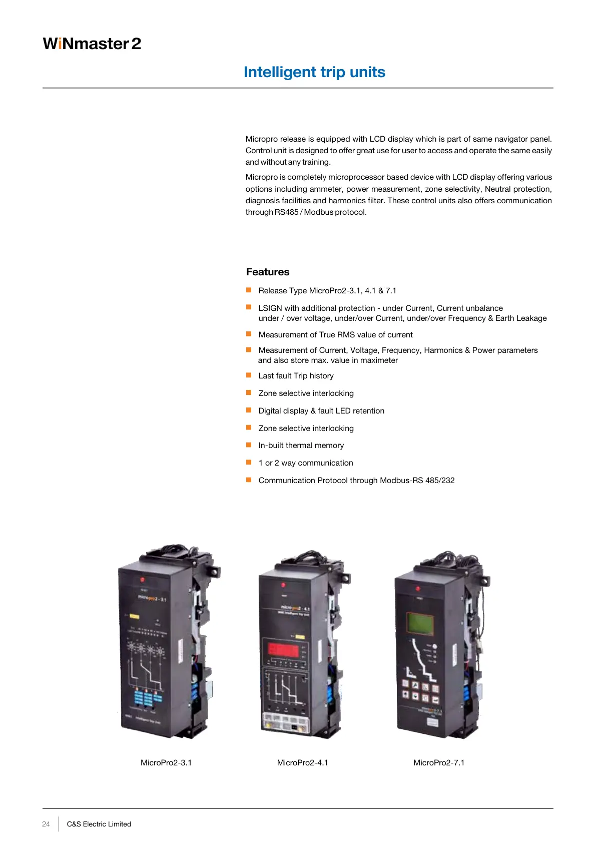 options including ammeter, power measurement, zone selectivity, Neutral protection,