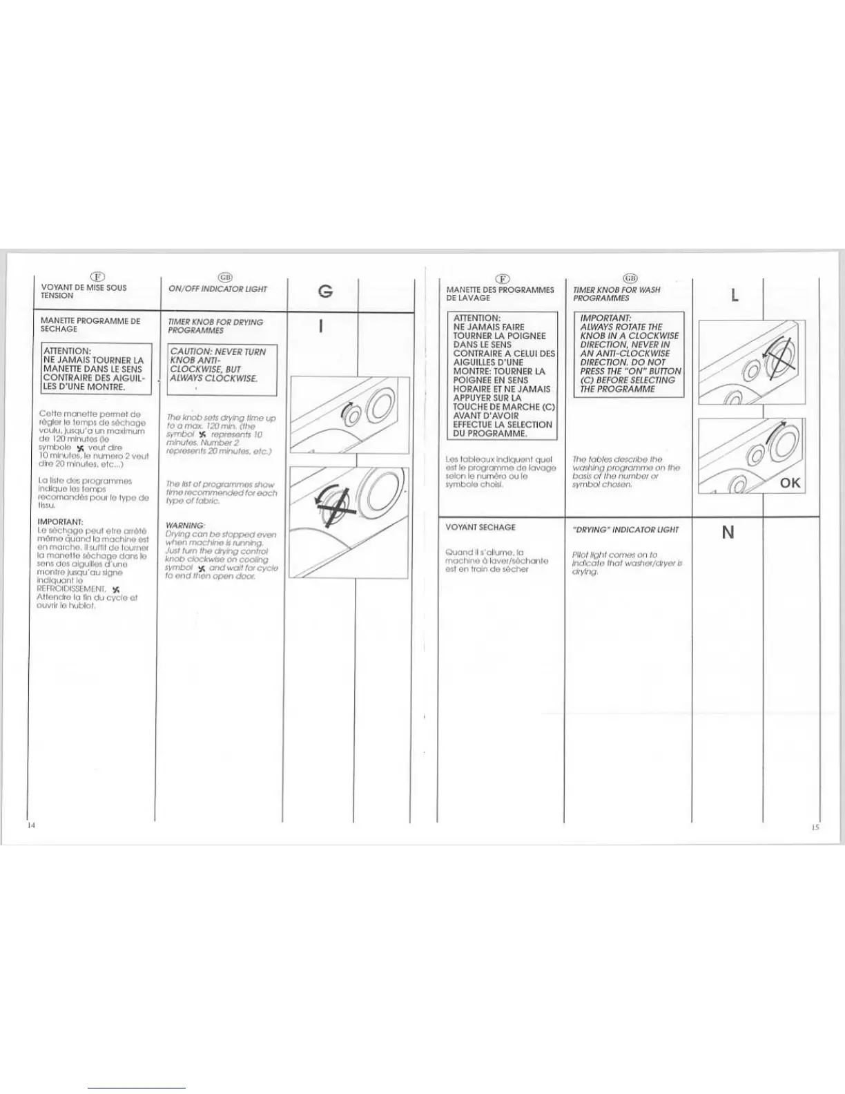 Candy Alise 081 - Control Knob and Indicator Light Functions; Power On Indicator Light; Drying Timer Knob Operation; Wash Programme Knob Operation