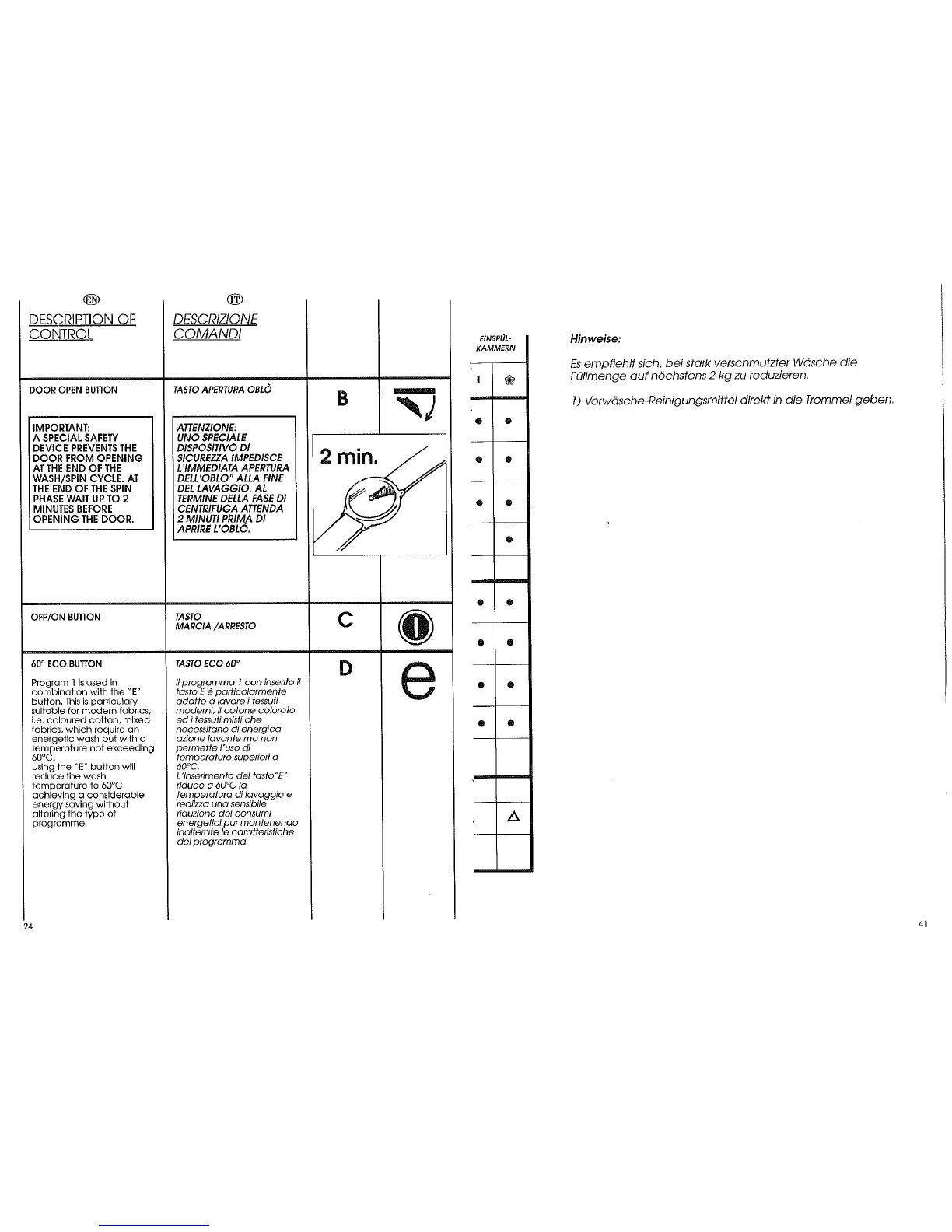Candy AQUAMATIC 6 - Description of Control; Door Open Button; Off;On Button; Eco Button