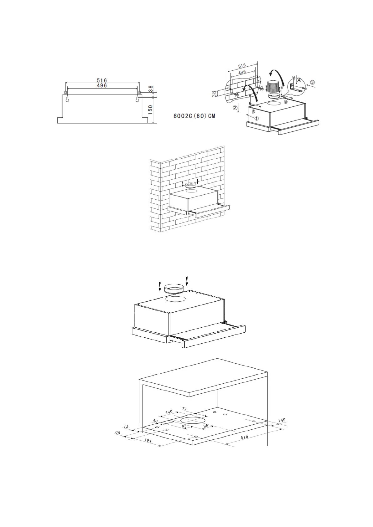 2. Postavite napu za štednjak na ormarić uporabom šest vijaka (4 x 35 mm) i ravnih podloški.
