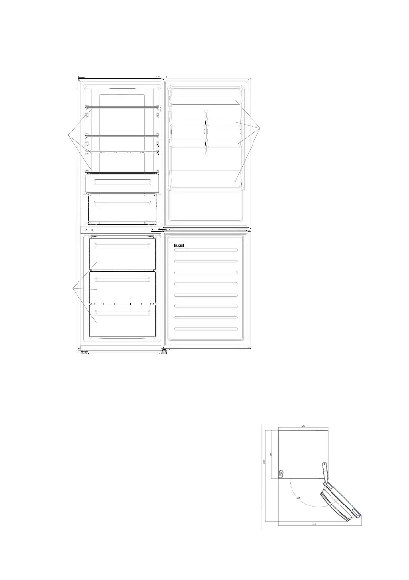 має бути встановлено висувні ящики, ящик для продуктів і полиці; див.