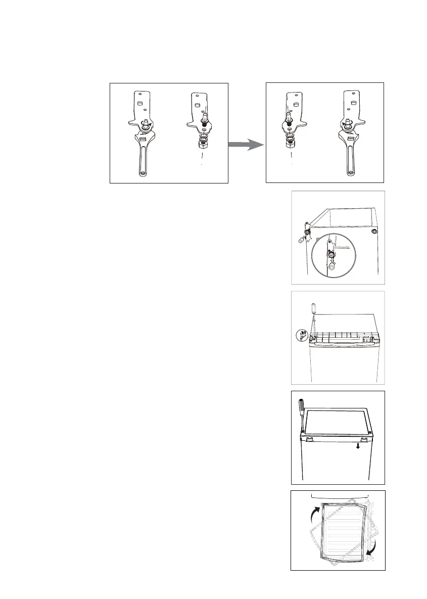 5. Draai de pen van het onderste scharnier los en verwijder deze, draai de haak om en plaats