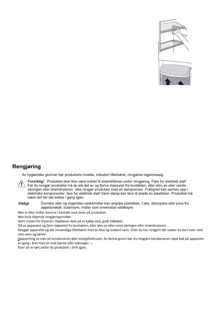 • Ikke oppbevar varm mat eller væsker som fordamper i kjøleskapet