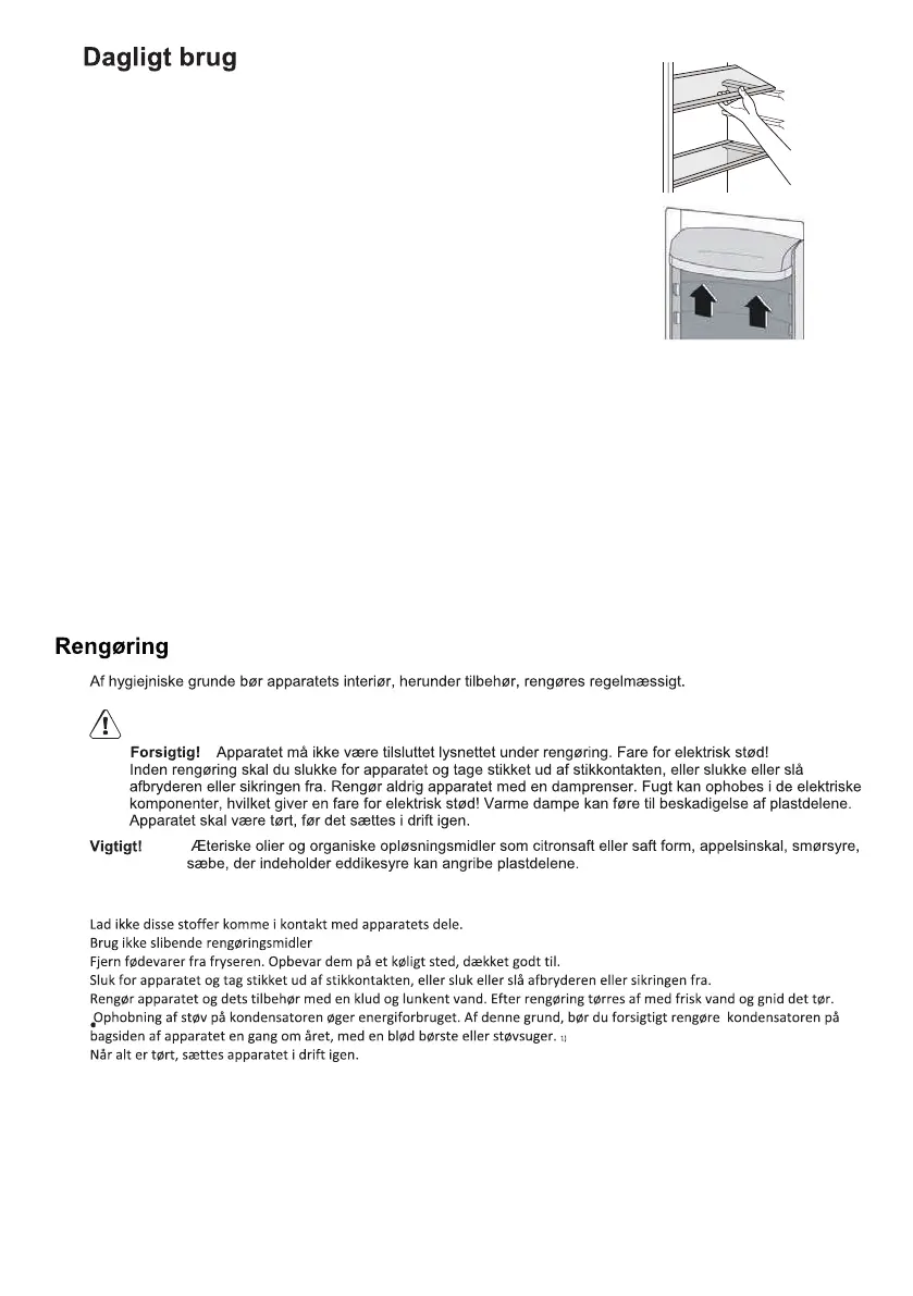 • Man må ikke anbringe varm mad eller væsker, som fordamper i køleskabet