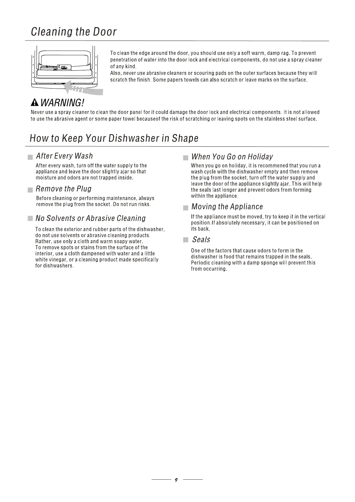 Candy CDP 4725 - Dishwasher Exterior Care; Door Cleaning and Exterior Maintenance; Long-Term Storage and Moving
