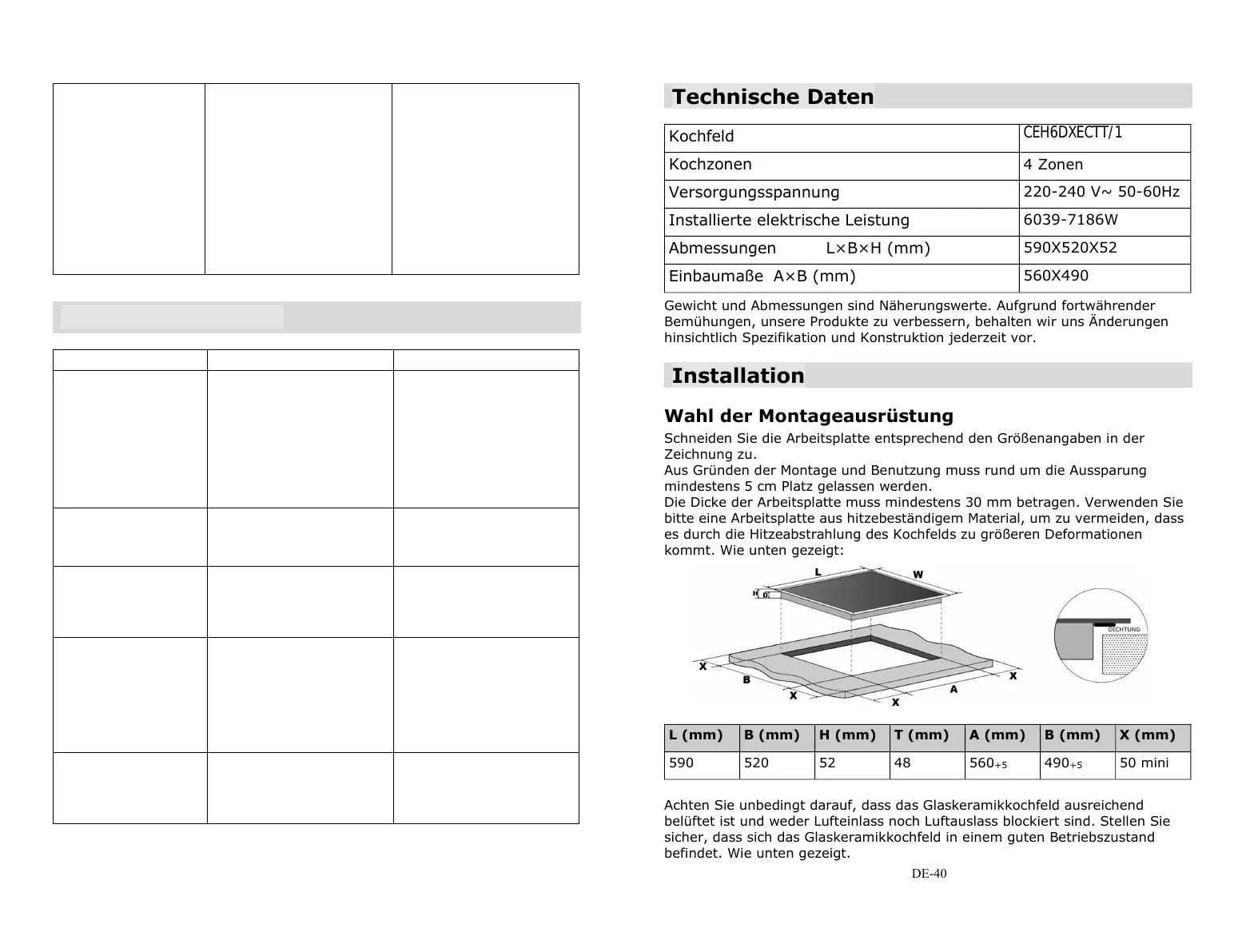 Die Dicke der Arbeitsplatte muss mindestens 30 mm betragen. Verwenden Sie