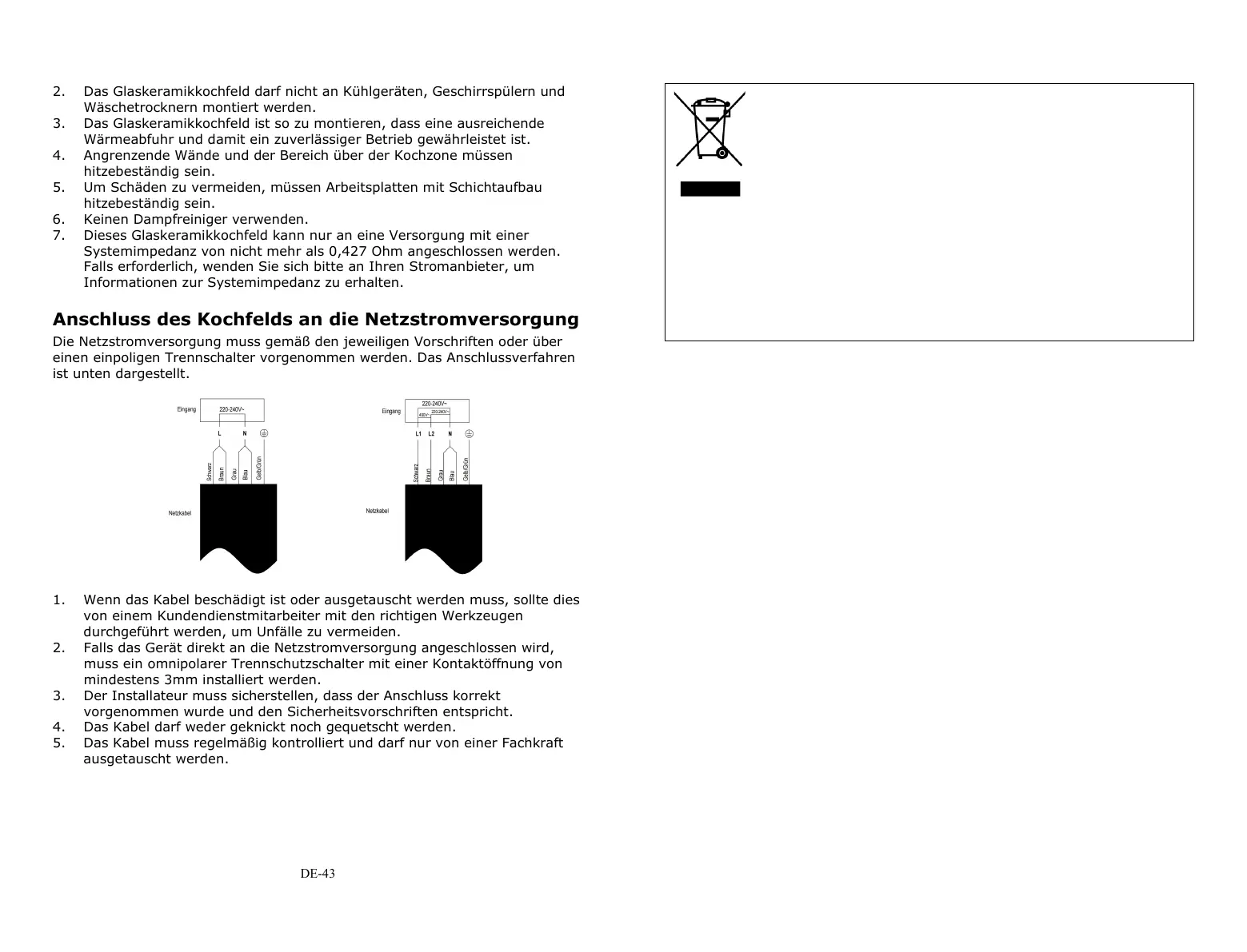 7. Dieses Glaskeramikkochfeld kann nur an eine Versorgung mit einer