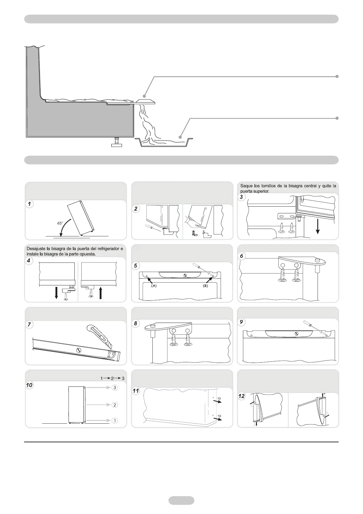 Para invertir el sentido de apertura de las puertas, siga las siguientes instrucciones en función del tipo de orificio y de bisagra que contenga su