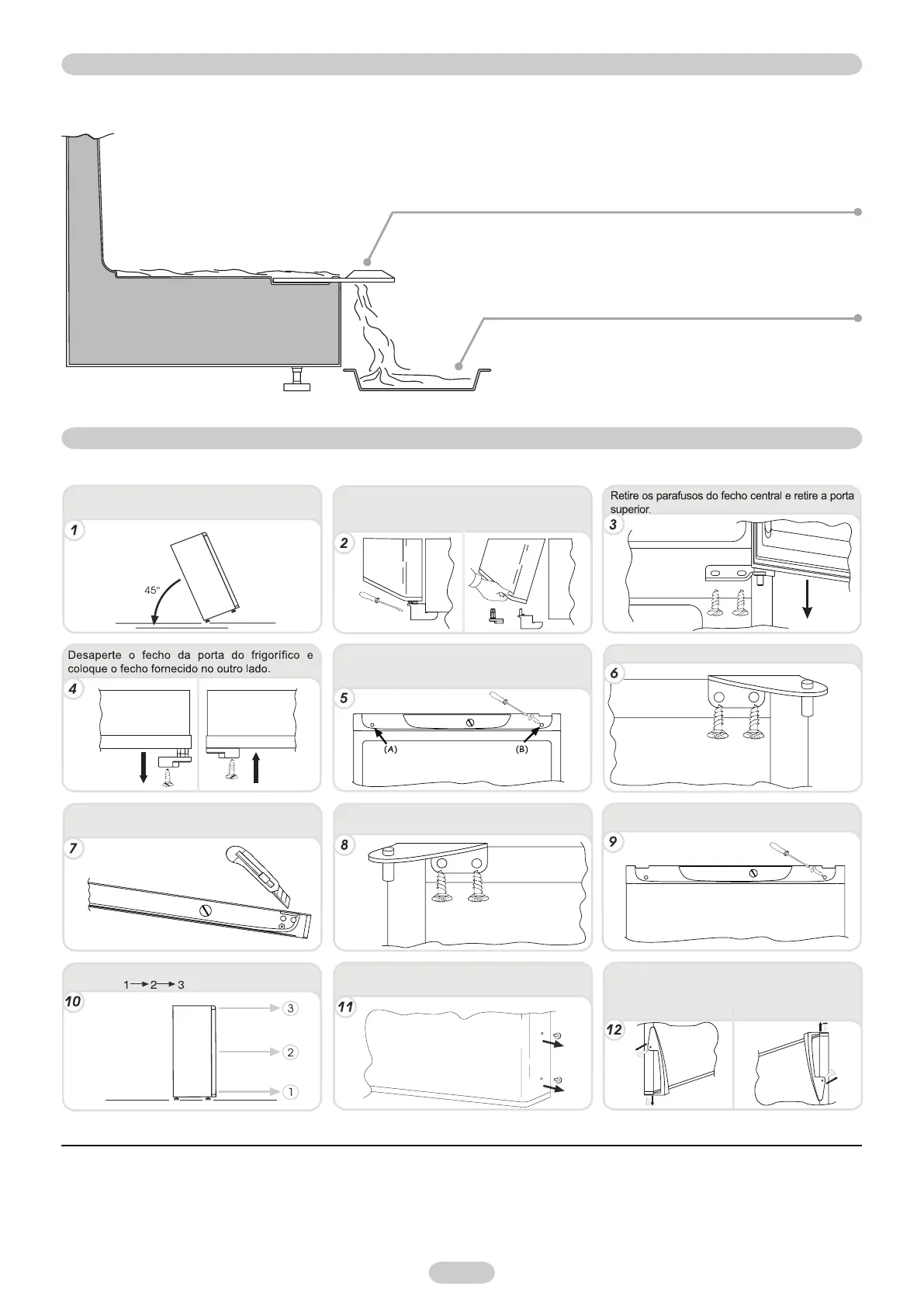 Para inverter a abertura das portas, siga as indicações relacionadas com o tipo de dobradiça e fecho incluídos no seu produto.