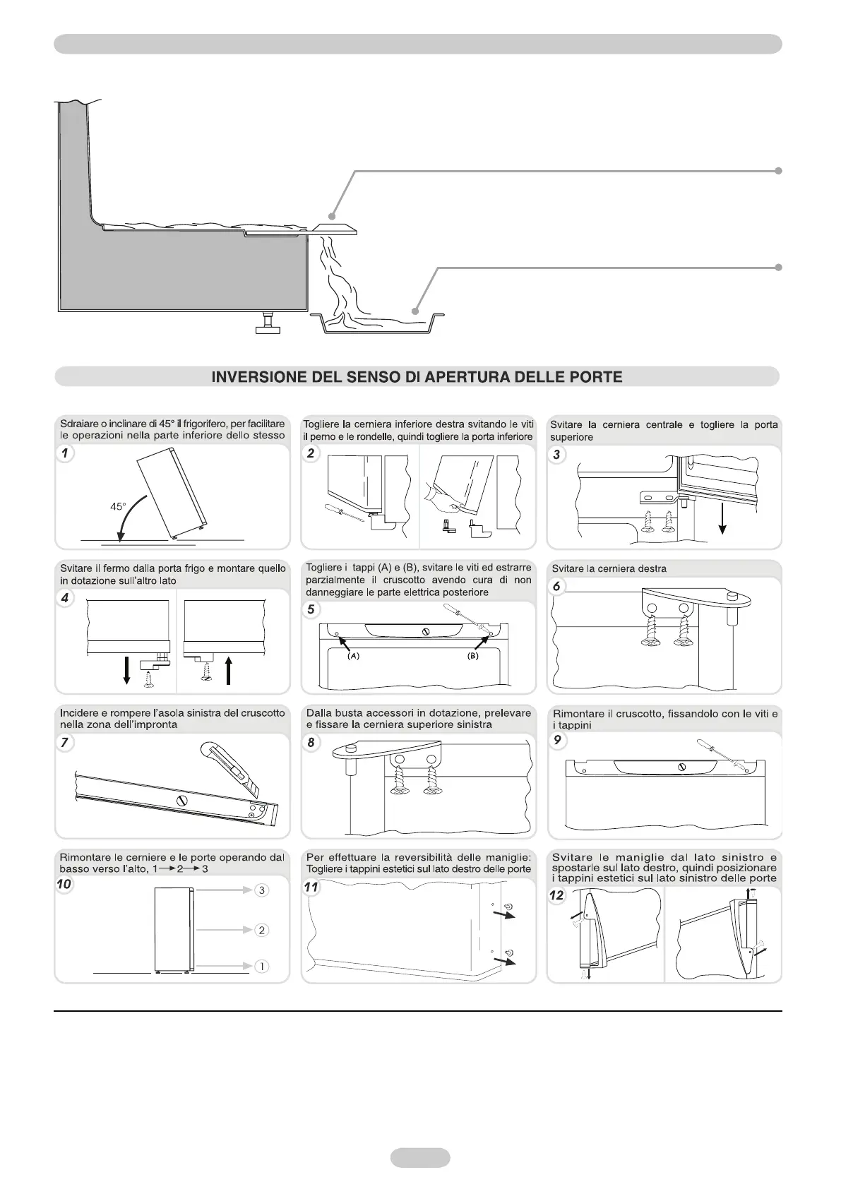 Per invertire il senso di apertura delle porte seguire le indicazioni in relazione al tipo di testata e di cerniera di cui il vostro prodotto è costituito.